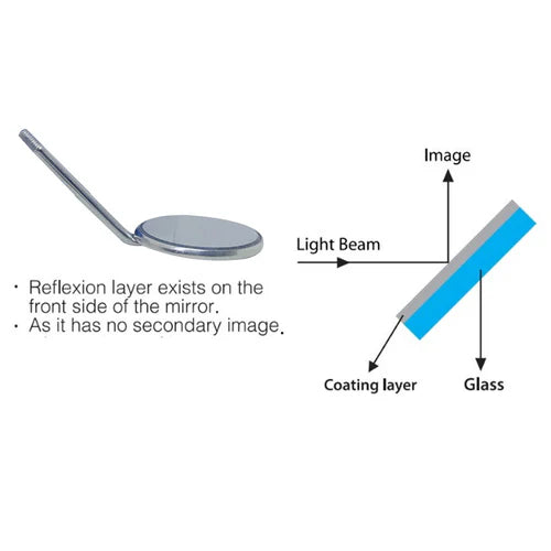Rhodium coated front surface mouth mirror tops with superior reflective property. Waldent Rhodium Coated Front Surface Mouth Mirror Tops - have superior reflective property and forms extra sharp images because of single reflection owing to the front surface coating.