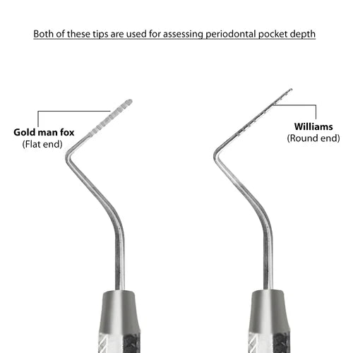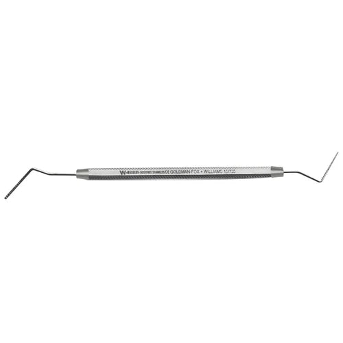They are manufactured from selective stainless steel by skilled workers with modern machines, keeping control on production and quality at every step to guarantee a supply of Instruments with utmost precision. The Dental probe is made up of stainless steel with a calibrated tip. Goldman Fox Probe has the same calibration as of Williams Probes but has flat end instead of round as of Williams. The working ends are marked in millimeters (1-2-3-5-7-8-9-10) for precise measurements. The calibrated periodontal probe is an instrument of assessment.